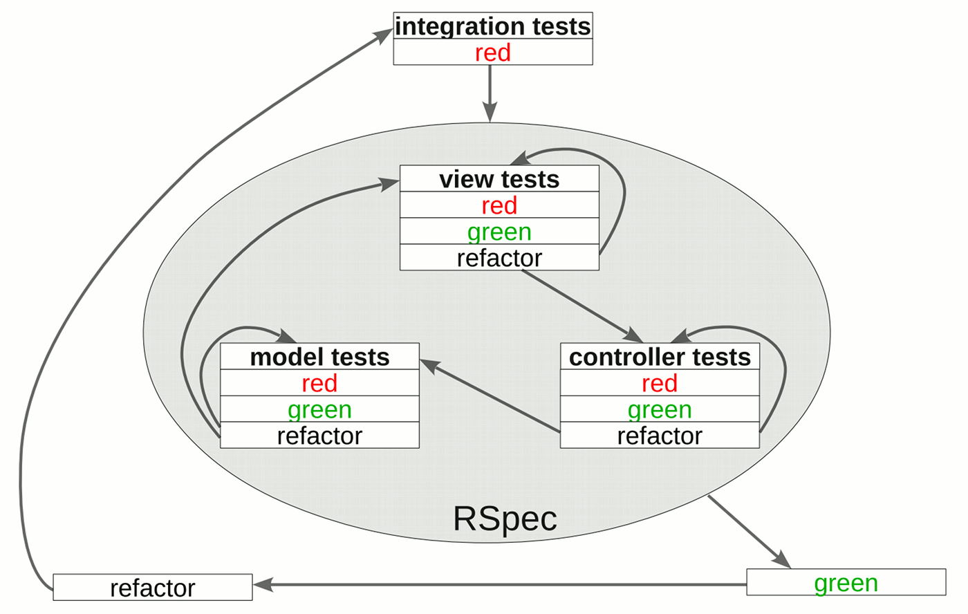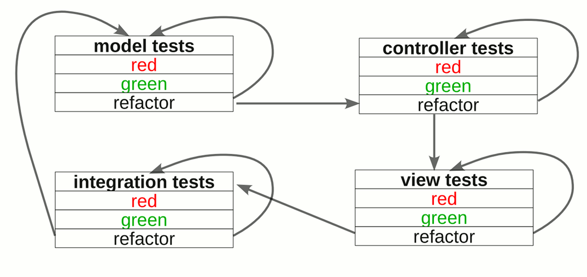 Test Driven Development is a bottom-up approach to development. Before we code a method, we write a test for it. From there we build up our program, writing tests along the way. The flow goes something like this:
