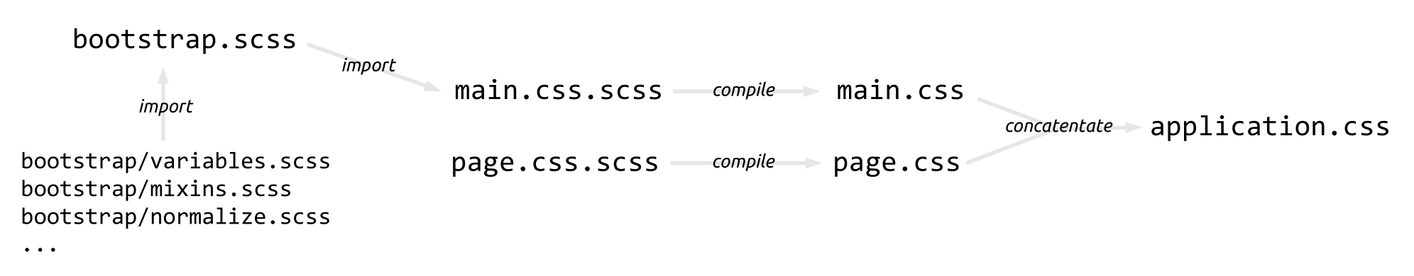 With these, you can even get files like page.js.coffee.erb. Looking at the bigger picture, though, you should be able to see how all this preprocessing chains lead to the Asset Pipeline being called by that term. Say you have an application that uses the Sass version of Bootstrap as well some other custom SCSS files: