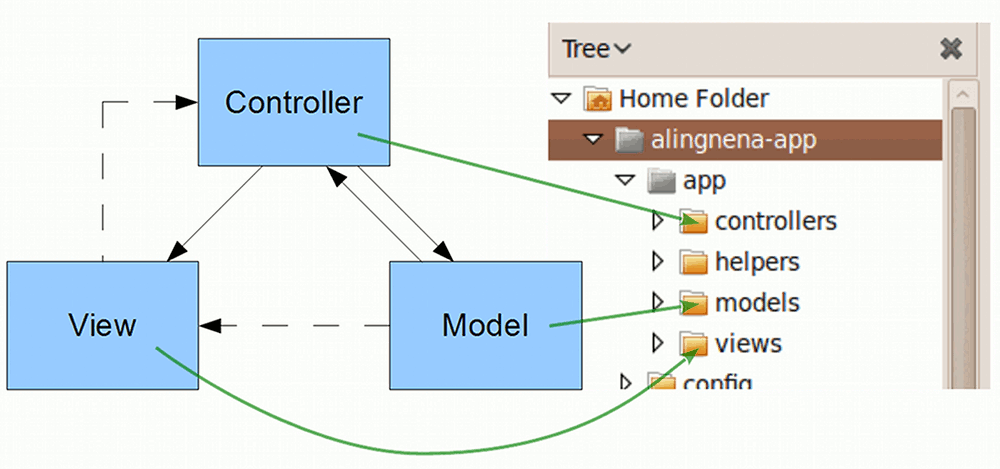 When you encounter a bug in a Rails application, you also have a better idea where to look for the problem. This diagram shows where the source code for the MVC components are located: