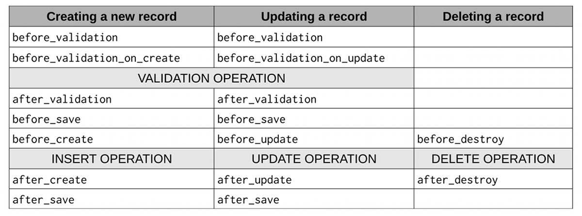 Callbacks are methods called by an Active Record object before and after the object is inserted, updated, or deleted from the database. Here is the list of callbacks performed in each of these operations: