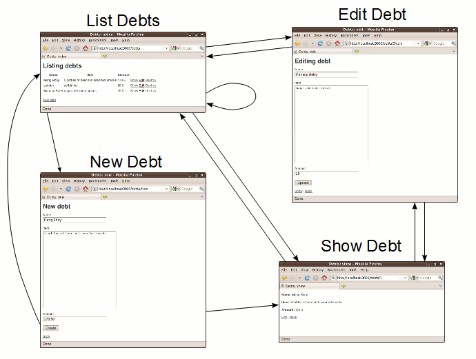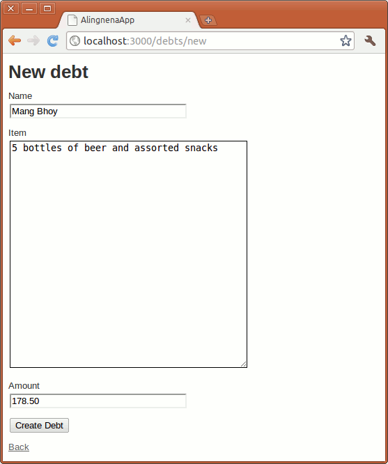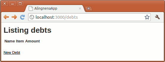 debt– the name of this part of the application. In the next chapter, we shall discuss the concept ofConvention Over Configuration and this is a prime example of that approach. Take note of how Ruby on Rails uses this single word as aconvention throughout the application:- “Debts” will become the name of the resource i.e. the table in the database.