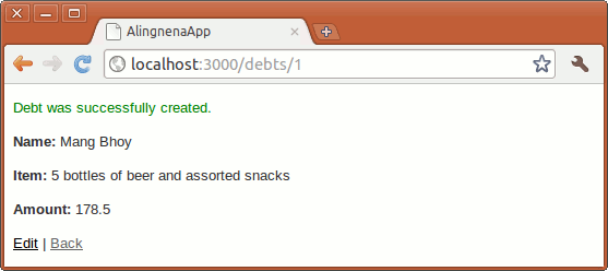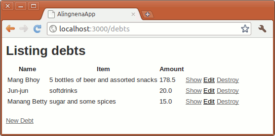 Finally, clicking the Back link will return you to the List Debts page. Each existing record has Show, Edit, and Destroy links so that Aling Nena can view, update, and delete the records, respectively.