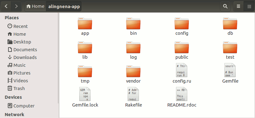 In this case, we named our application “alingnena-app” and the following directory structure was created by rails: