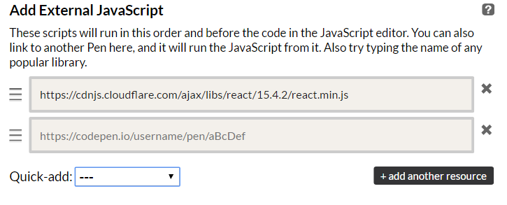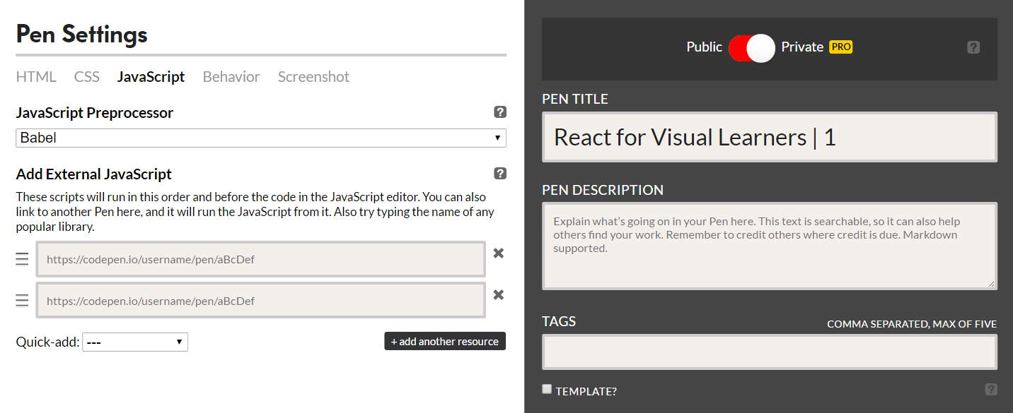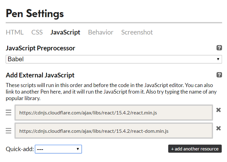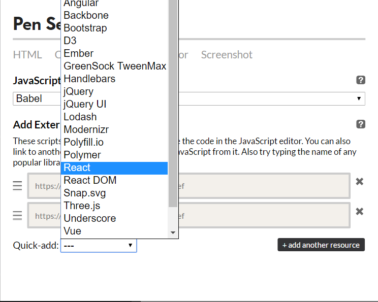 Now that we have added and explained Babel, we will need to add React as an external library to our pen.