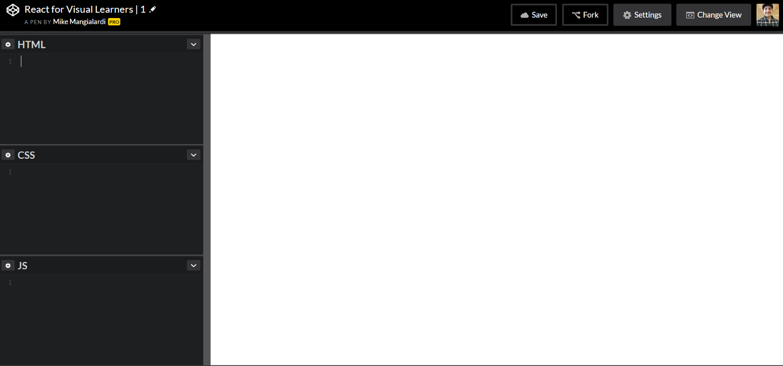 Once you have your new pen open, let’s start by naming it React for Visual Learners | 1.
