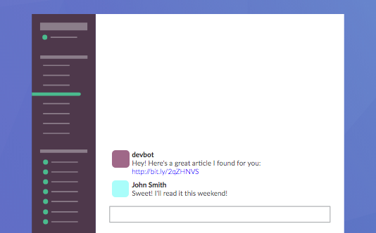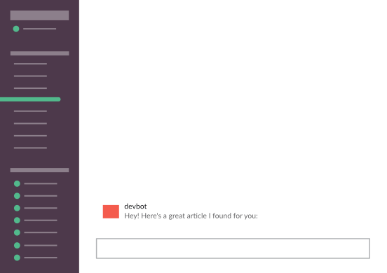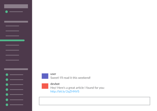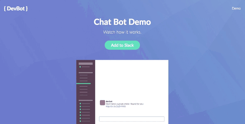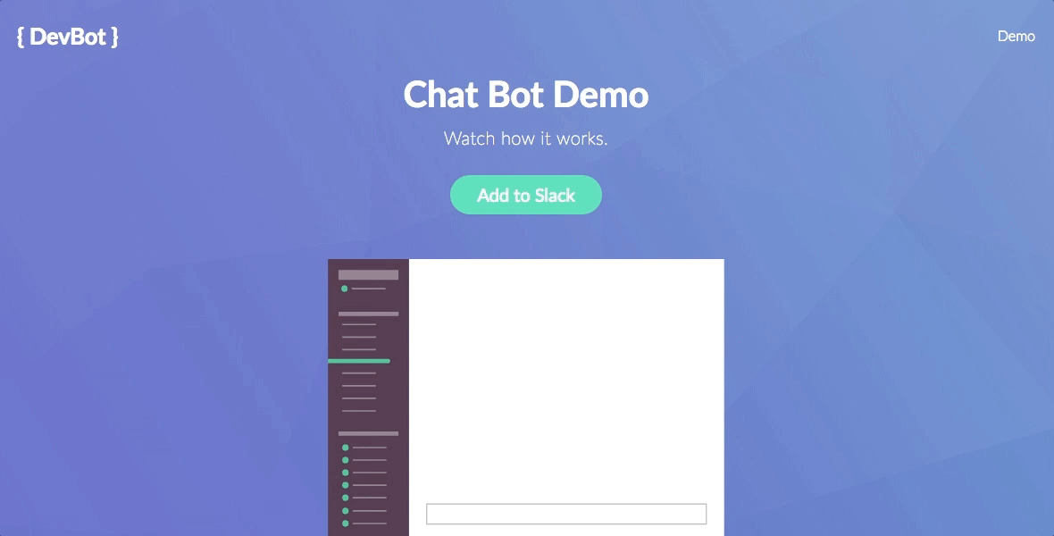 On one hand, it could be very simple. Instead of actually making the chat bot, we could just do some visual tricks to make it appear as if there was a chat bot demo in our Demo view. For example, we could have an image of a Slack channel with no message. After a few seconds, we change the image to a Slack channel with a message from a user to the chat bot. After a few more seconds, we could switch the image to a Slack channel with a response from the chat bot. We then could repeat this process. In total, it would create the visual appearance of a chat bot demo.