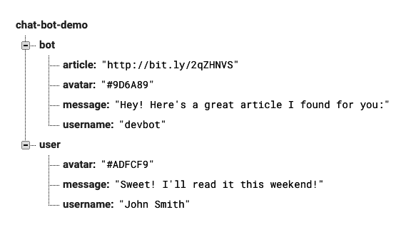 While we won’t be creating our own server, we will use a cloud-based database called Firebase. Firebase will store the information used to populate the UserMessage and ChatBotMessage components. Specifically, the usernames, avatar colors, message texts, and the article link will be stored and retrieved from Firebase to populate the components instead of us manually passing down props.
