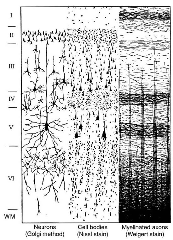 The right side of the image is a stain that shows only myelinated axons. (Myelination is a fatty sheath that covers some but not all axons.) In this part of the image you can see two of the main organizing principles of the neocortex, layers and columns. Most axons split in two immediately after leaving the body of the neuron. One branch will travel mostly horizontally and the other branch will travel mostly vertically. The horizontal branch makes a large number of connections to other cells in the same or nearby layer, thus the layers become visible in stains such as this. Bear in mind that this is a drawing of a slice of neocortex. Most of the axons are coming in and out of the plane of the image so the axons are longer than they appear in the image. It has been estimated that there are between 2 and 4 kilometers of axons and dendrites in every cubic millimeter of neocortex.