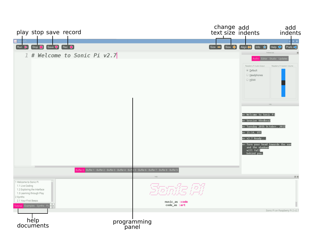 This is the Sonic Pi interface; it has three main windows. The largest one is for writing your code, and we call it the Programming Panel. There is also an output panel that displays information about your program as it runs. When you click on the help button at the top of the window, the third panel appears along the bottom displaying help documentation. This contains information about different code you can try and use, as well as different synth sounds, samples, and much more.