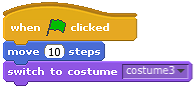 - Select costume3 from the drop-down menu on the purple block.
