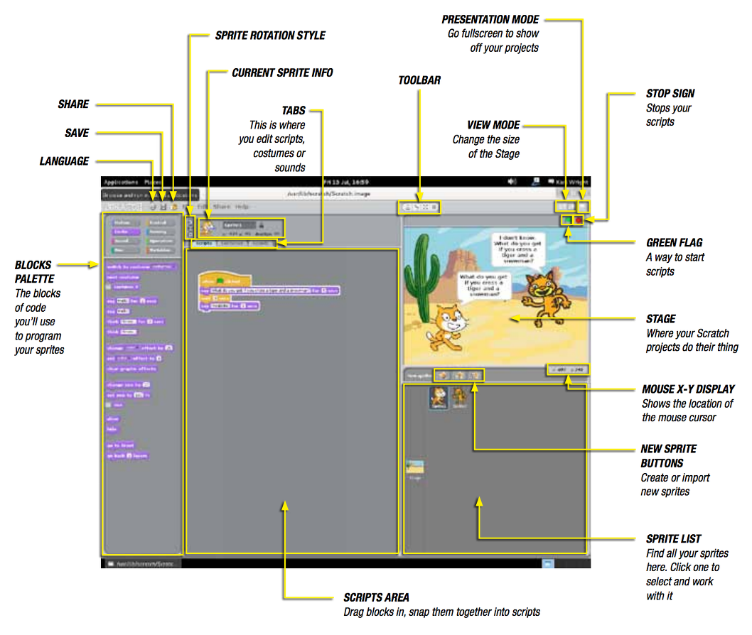 You’ll find Scratch in the Menu under Programming. Once opened you will see a window like this: