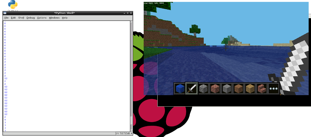 With Minecraft running, and the world created, bring your focus away from the game by pressing the Tab key, which will free your mouse. Open Python 3 from the application menu and move the windows so they’re side-by-side.
