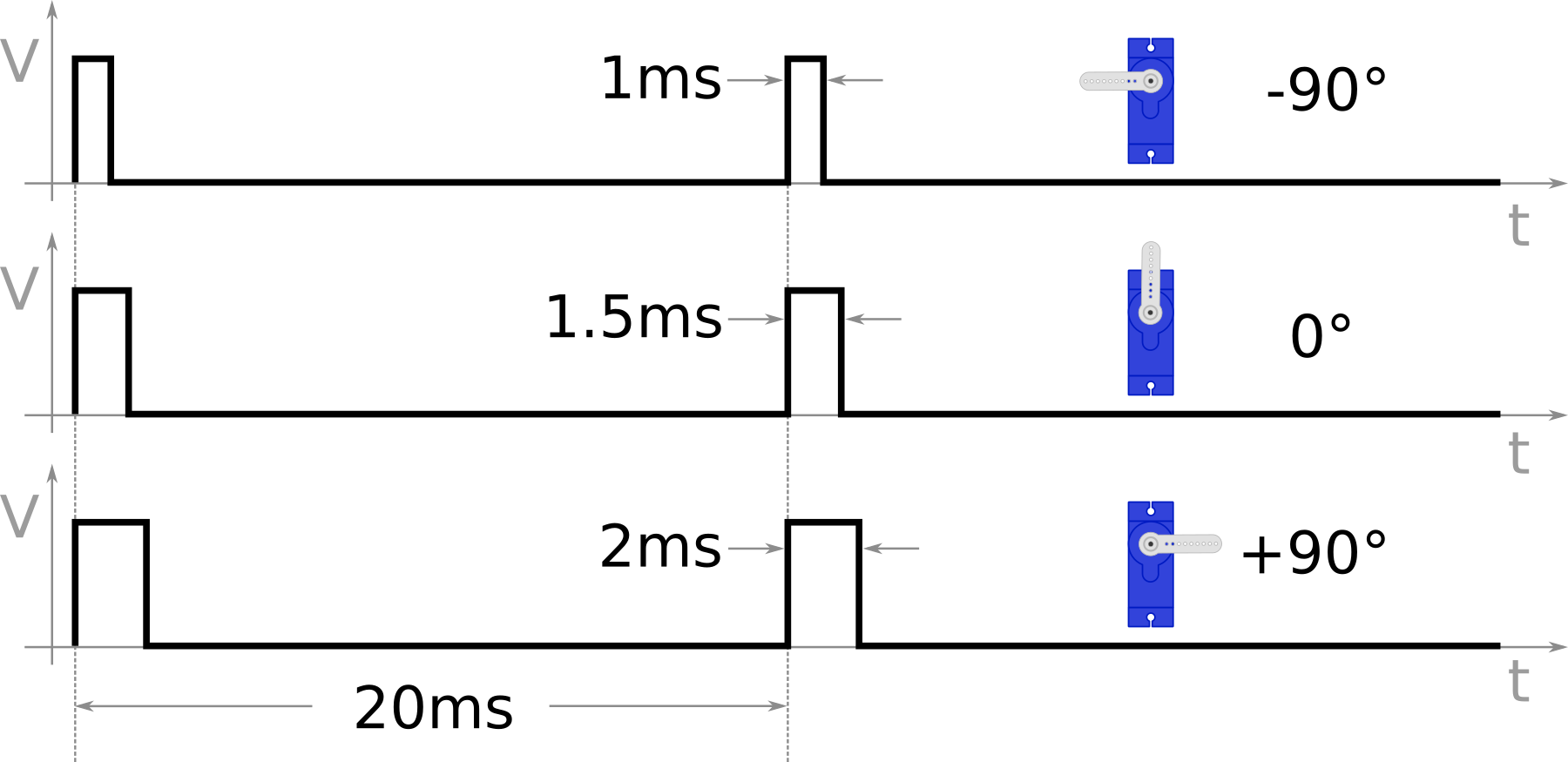 The controlling signal is a pulse of variable width, and thus the controlling mechanism is named Pulse Width Modulation (PWM). A pulse is sent every 20 milliseconds. The width of the pulses determine the position of the shaft. So, a pulse width of 1ms will move the shaft anticlockwise by 90°, a pulse of 1.5ms will move the shaft to a ‘neutral’ position at 0° and a pulse of 2ms will move the shaft clockwise by +90°.