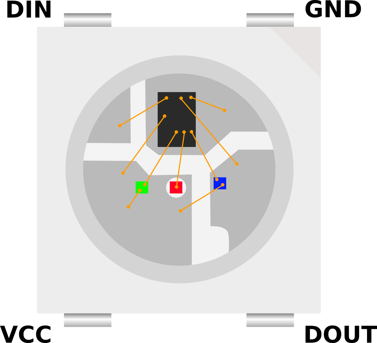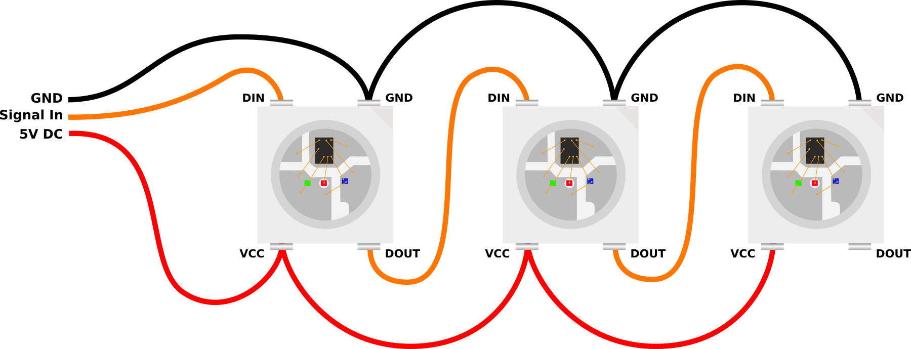 Each package has four pins – VCC, Ground, DIN (Data IN), and DOUT (Data OUT). The controlling connection from our Pico goes to the DIN pin and follow on LEDs are daisy chained from the initial devices DOUT pin to the follow on devices DIN. Thus, the controlling signal only requires a single wire from our Pico (Although it will still require power in the form of VCC (5V) and ground).