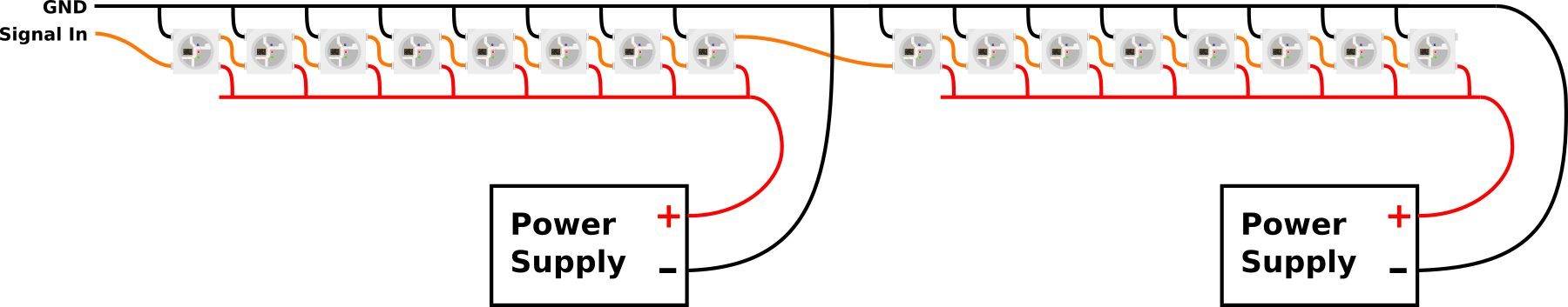 If we were using a larger number of connected LEDs it might be necessary to divide your strip into different sections and connect separate power supplies. This could be because you need a certain amount of current to drive the LEDs or it could be because of the voltage drop that will occur over longer distances due to the resistance of the copper connecting wires.