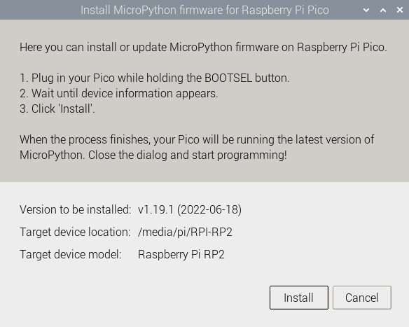 Follow the instructions to plug in the Pico while holding the BOOTSEL button. Once the device information appears (or at the least, the ‘Install’ button isn’t greyed out), click on ‘Install’.