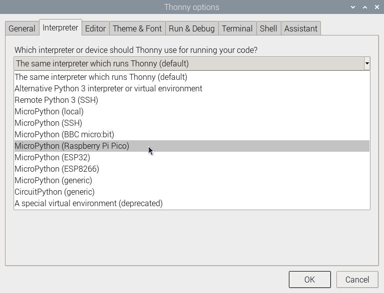 In Thonny go to Tools > Options and click on the Interpreter tab. From the interpreter dropdown list select MicroPython (Raspberry Pi Pico).