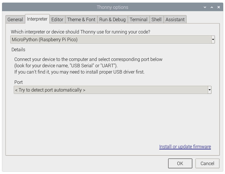 To do this, on the Thonny menu go to Tools >> Options and then select the ‘Interpreter’ tab