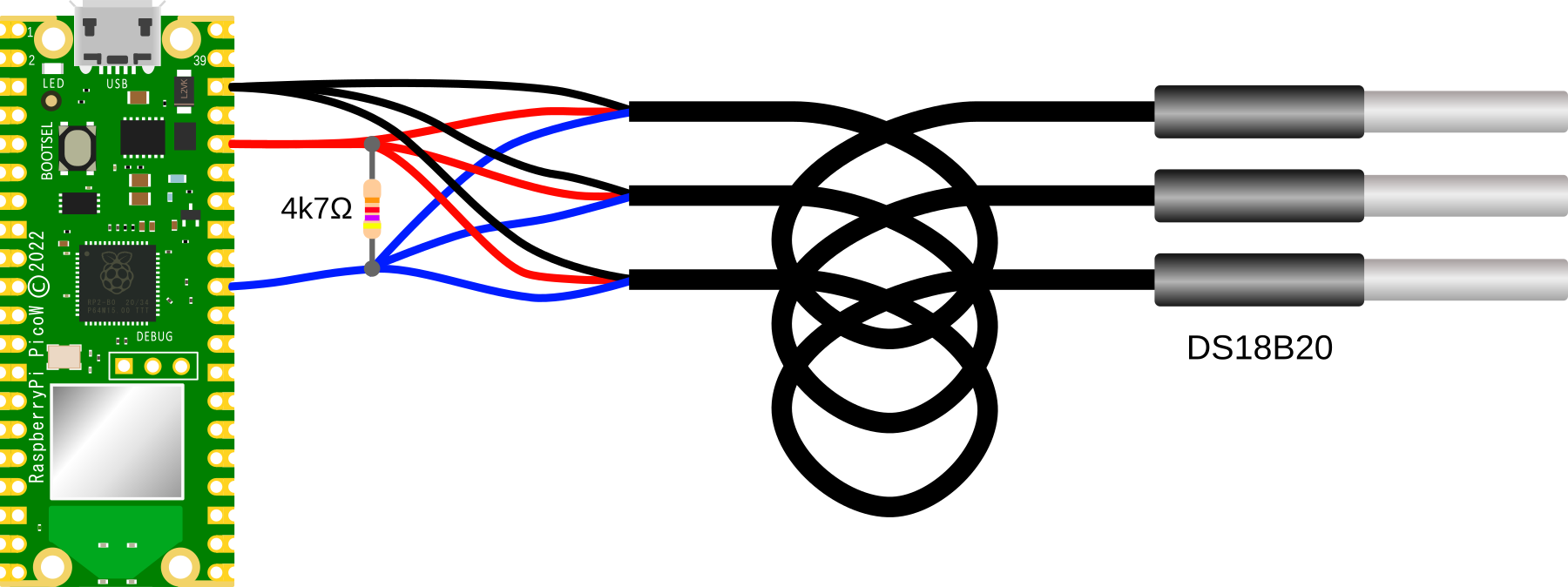The DS18B20 can be powered from the signal line, but in our project we will use the supply from the Pico.