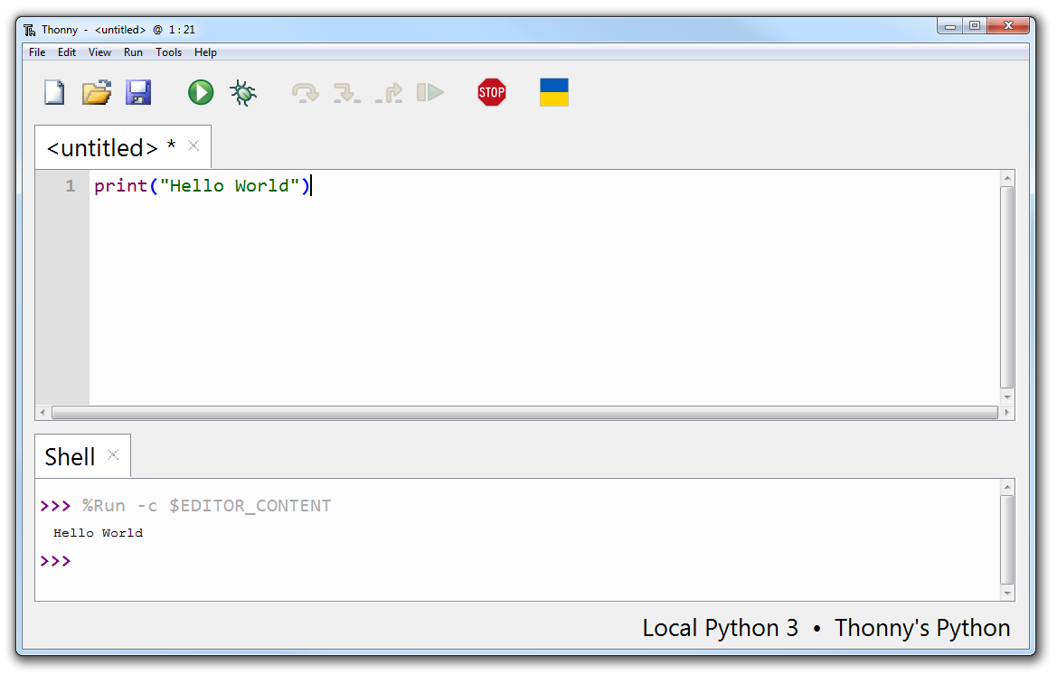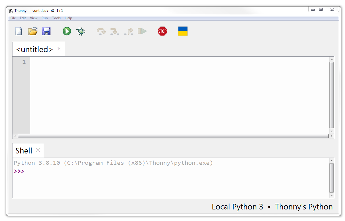 The basic Thonny interface as shown provides us with a code editor in the top section, where we will write all of your code. The bottom half is our ‘Shell’, where we will see any output when we run our code.