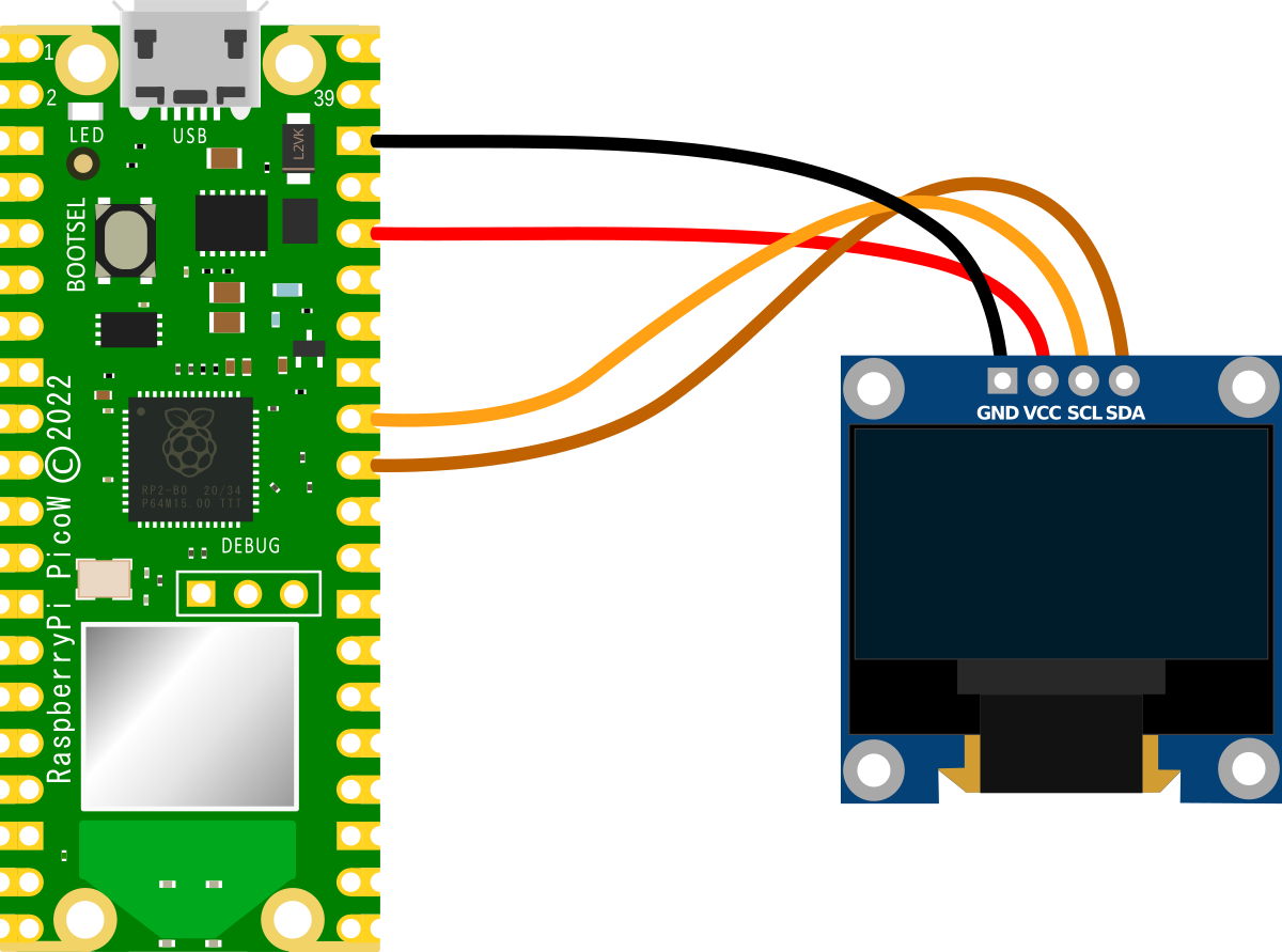 - Display SCL to I2C1 SCL (pin 32, or GPIO27) on the Pico (Orange)