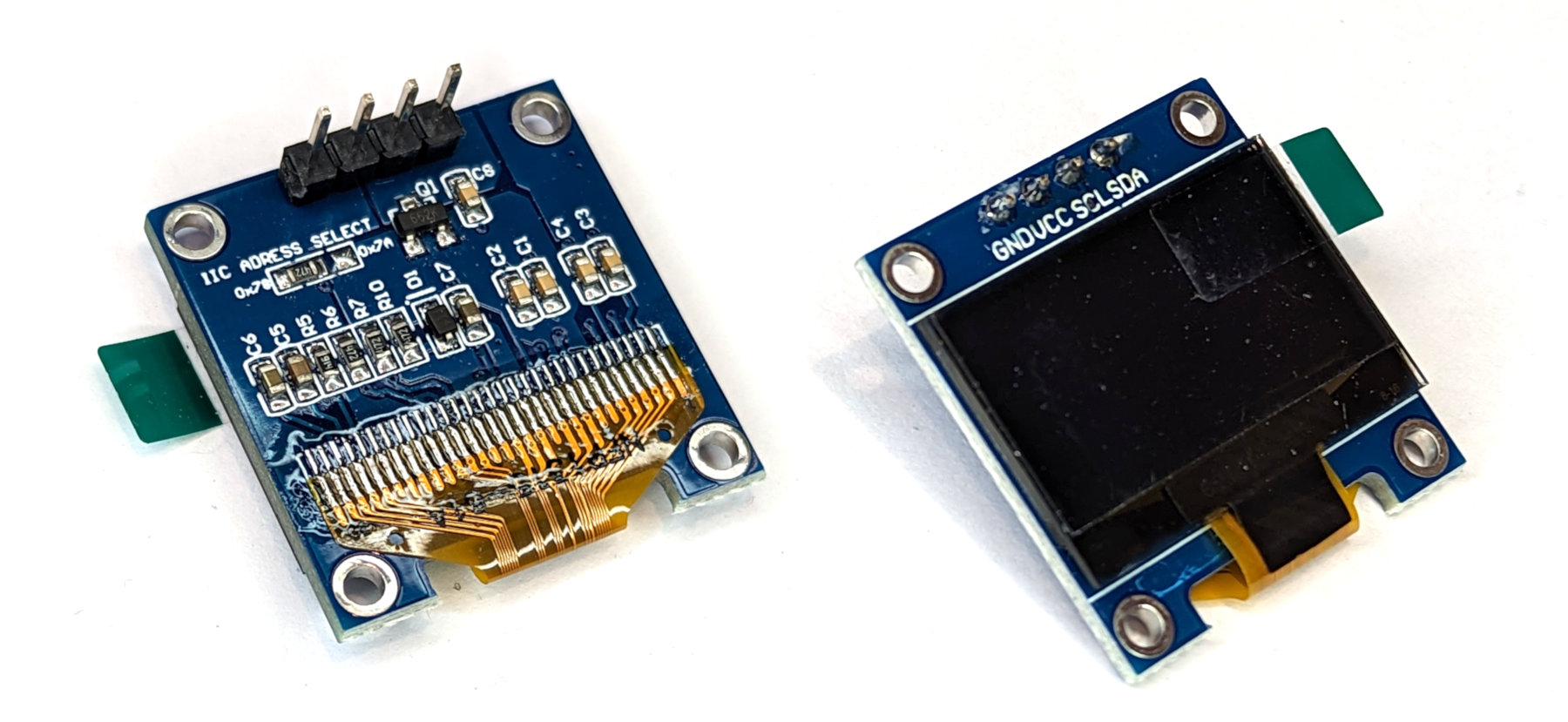 The display that we’ll use in this example is based on the SSD1306 driver chip, which acts as a bridge between the display matrix and the Pico. The matrix can come in a variety of resolutions (128x64, 128x32, 72x40, 64x48) and colours (white, yellow, blue). The display itself uses an organic light-emitting diode (OLED) technology that allows it to be bright, fairly detailed and to have a wide viewing angle. It also doesn’t hurt that the device is also very reasonably priced.