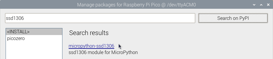 - Type ‘ssd1306’ in the search bar and click on ‘Search on PyPI’. This will return a few results.