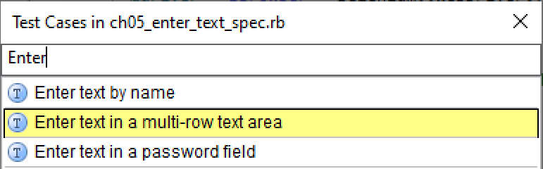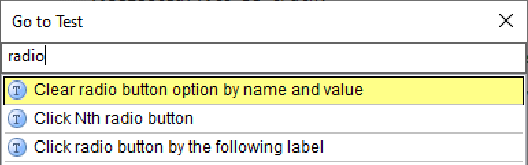 A pop-up window lists all test cases in the project for your selection. The finding starts as soon as you type.