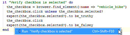 Move caret to a line within a test case (between it "..." do and end). Right mouse click and select “Run '...'”.