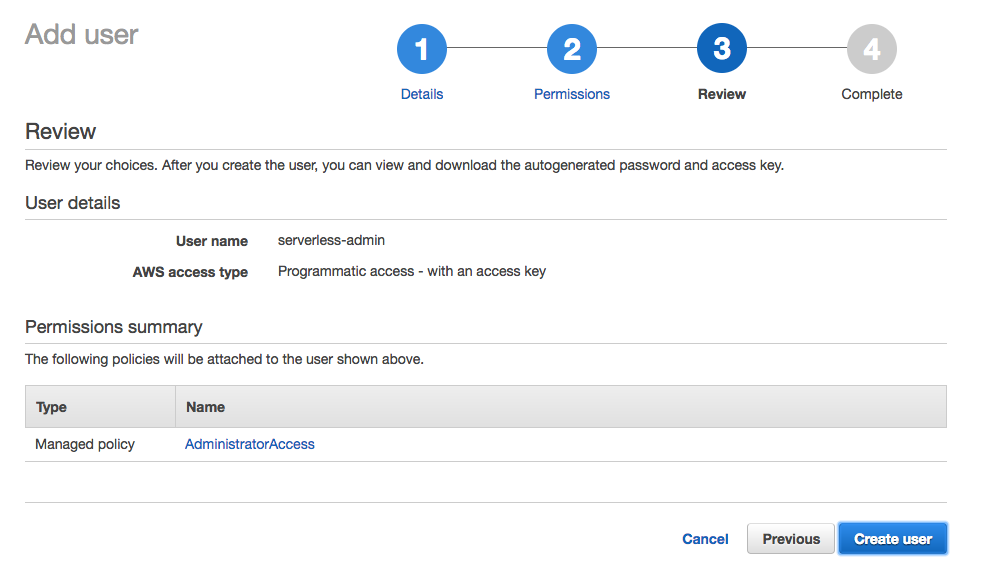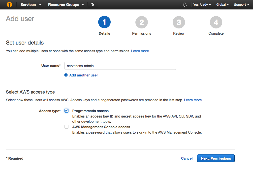 Click on the Add user button. Enter serverless-admin, tick the Programmatic access Access type checkbox, and select Next: Permissions.