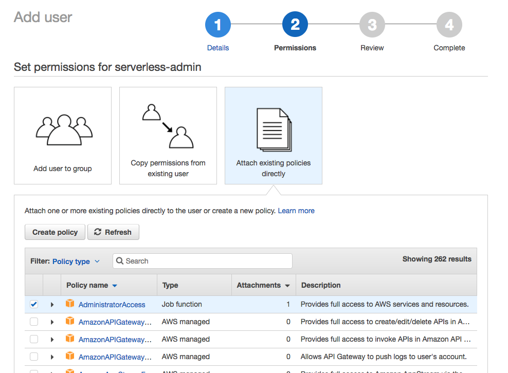Once you’ve signed up, you’ll need to create an AWS user which has administrative access to your account. This user will allow the Serverless Framework configure the services in your AWS account.