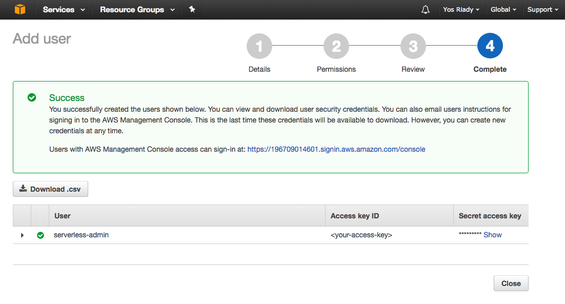 Done! We’ve now created a user which can perform actions in our AWS account on our behalf (thanks to the Administrator Access policy).