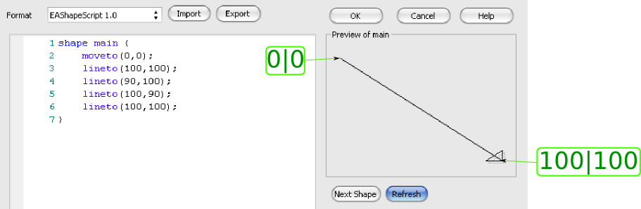 Now the important part: check the Shape Script radio button and click Assign5. This will open the Shape Script editor where you can type the script in the left pane. By clicking Refresh you will see the resulting image in the right one6.