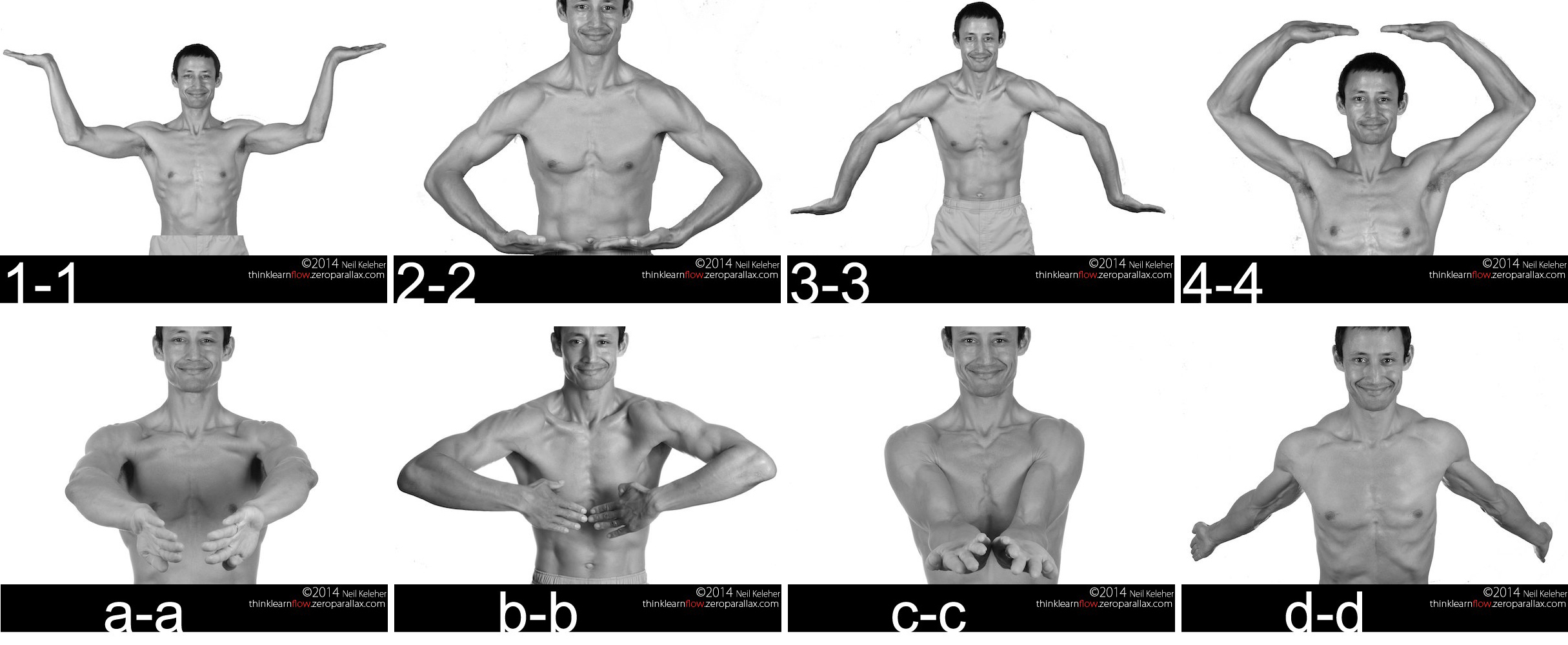 Notice the position of the palms, upright or outright. Also notice the height of the hands relative to the top of the head or the belly, (use the belly button as a reference). Also notice the direction the fingers point, outwards or inwards, forwards or backwards. Further, particularly for the vertical positions, notice the direction the elbow points in.