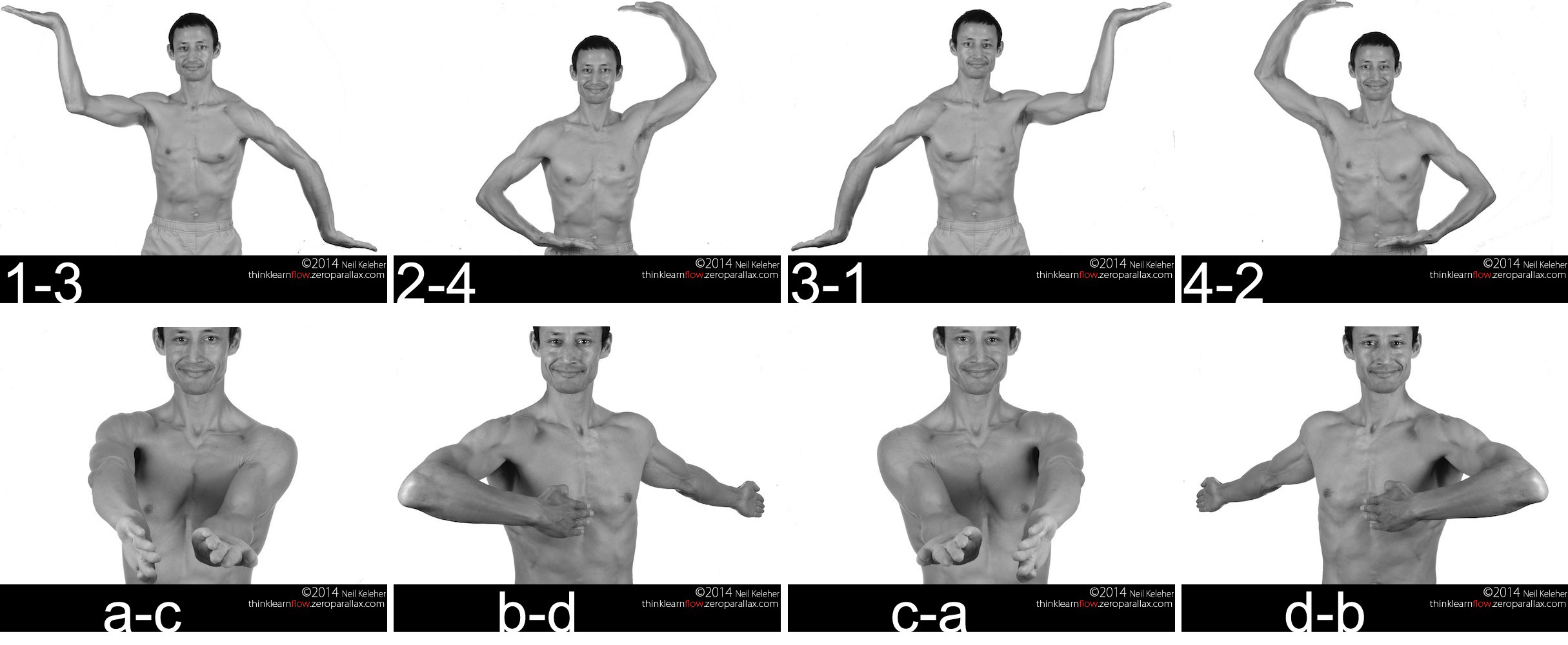 All images are mirrored so that the position of my right arm shows the desired position of your left arm.
