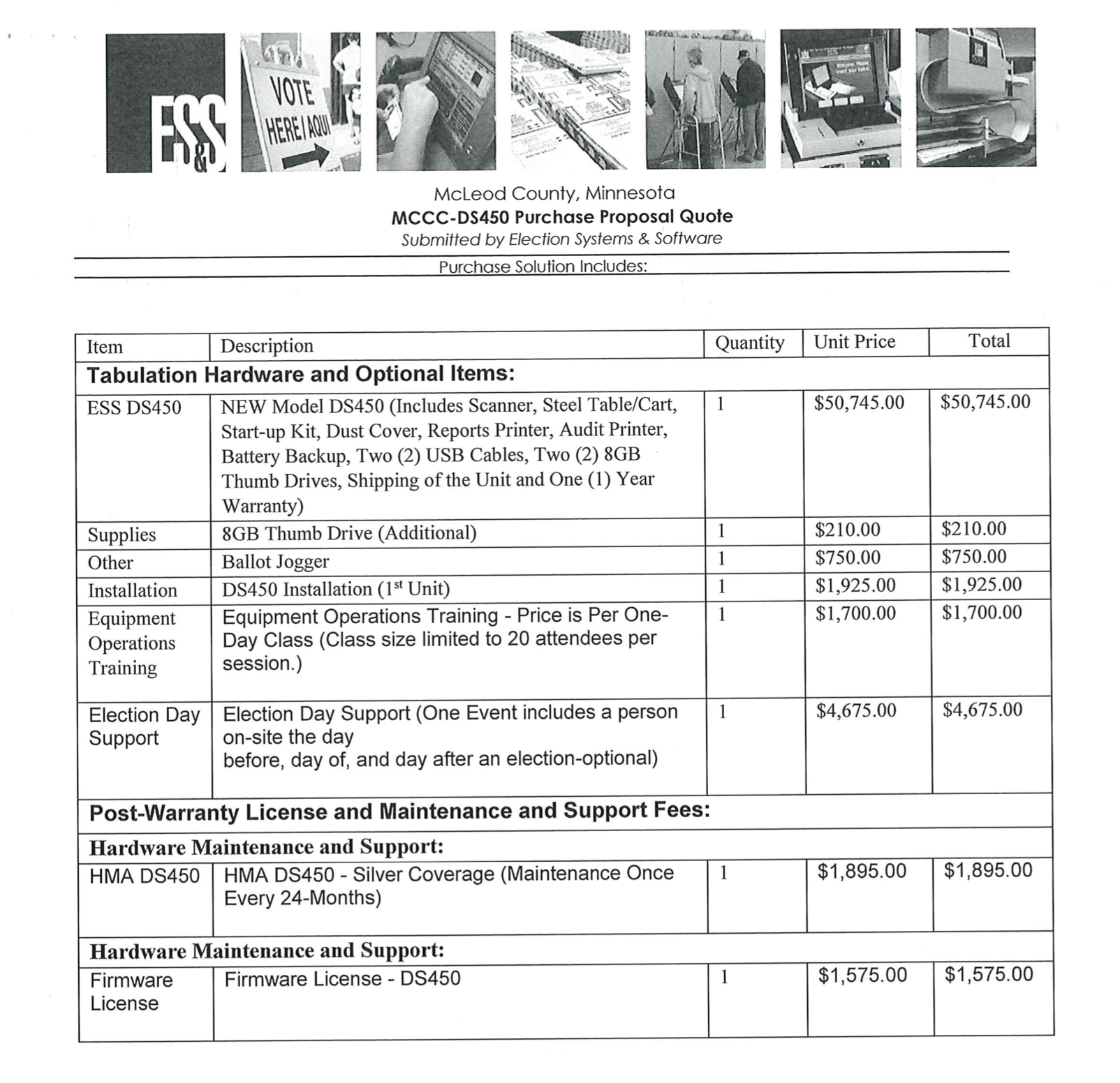 Even the Site Support at $4,250 alone could be repurposed toward 20 election judges at $20 an hour for 10 hours. Many more election judges could be hired with the $50,000 spent on the DS450 tabulator. Furthermore, if we legislatively removed or dramatically shortened the absentee and early voting periods, absentee ballot board work would be reduced and the election process further simplified.
