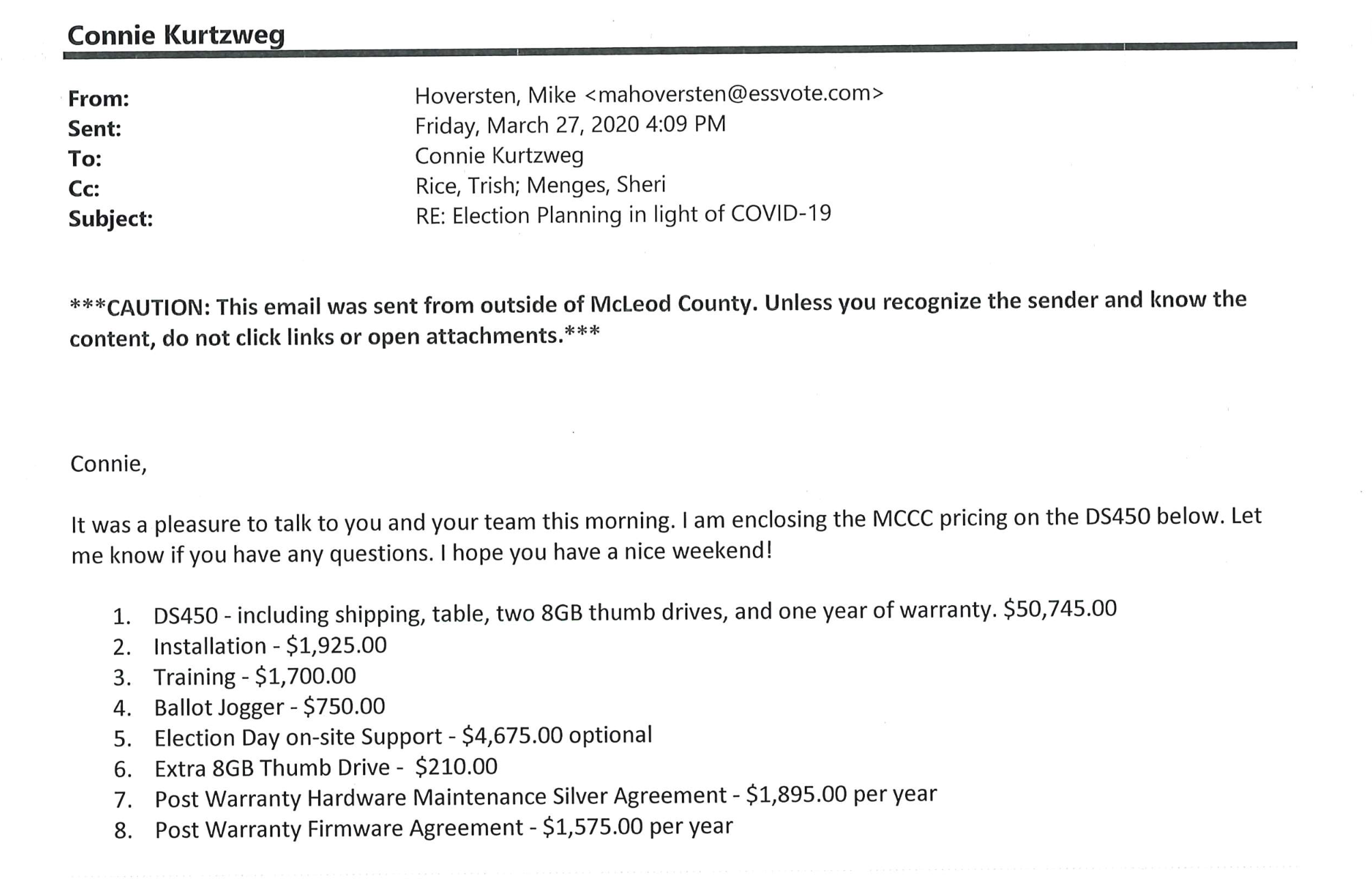 In the same Morrison County meeting, there was concern that the county was already locked into a rather large contract with the software and hardware vendor. That was a sunk cost if they were to switch to hand tallying. Jeremy Pekula made the point that over time hand counting would be much cheaper and welcomed by the community.