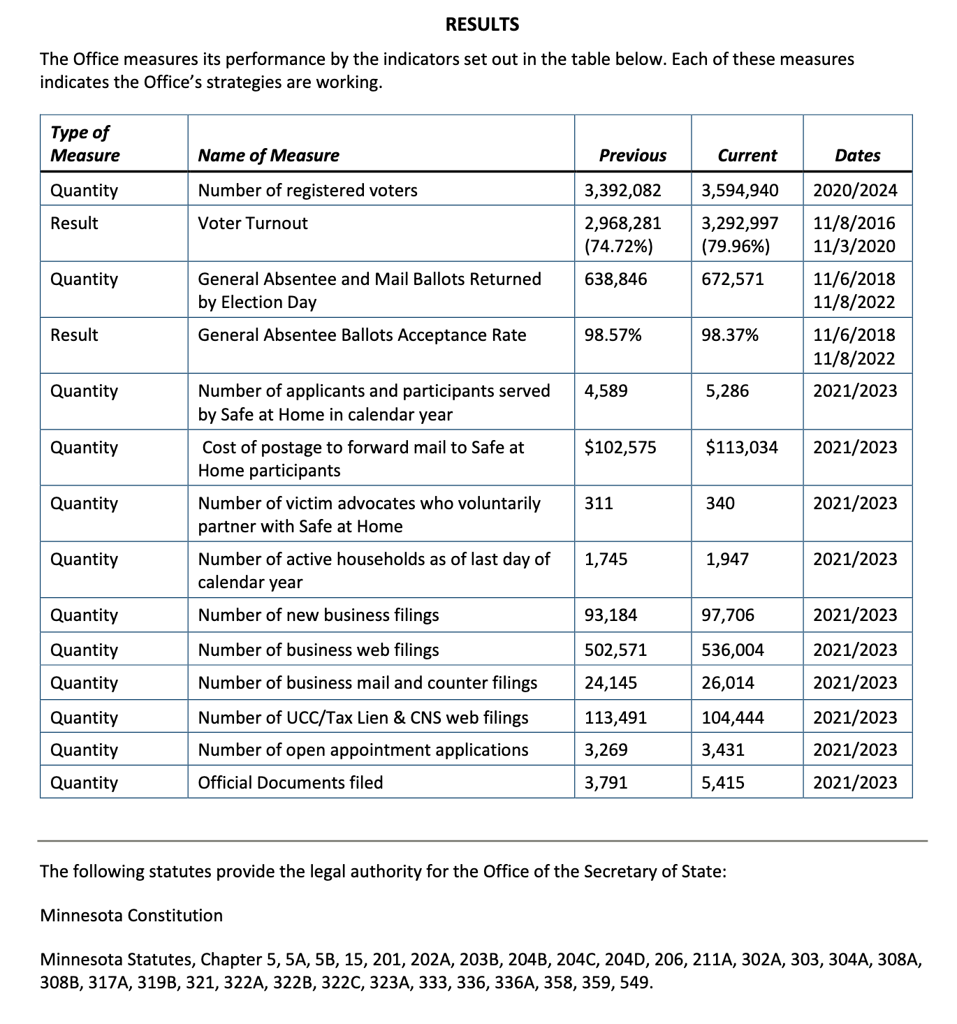 The reader can look at the following to get a sense of not only the secretary of state but the scope of his or her overall office, the Office of the Secretary of State: Minnesota Statutes, Chapter 5, 5A, 5B, 15, 201, 202A, 203B, 204B, 204C, 204D, 206, 211A, 302A, 303, 304A, 308A, 308B, 317A, 319B, 321, 322A, 322B, 322C, 323A, 333, 336, 336A, 358, 359, 549.