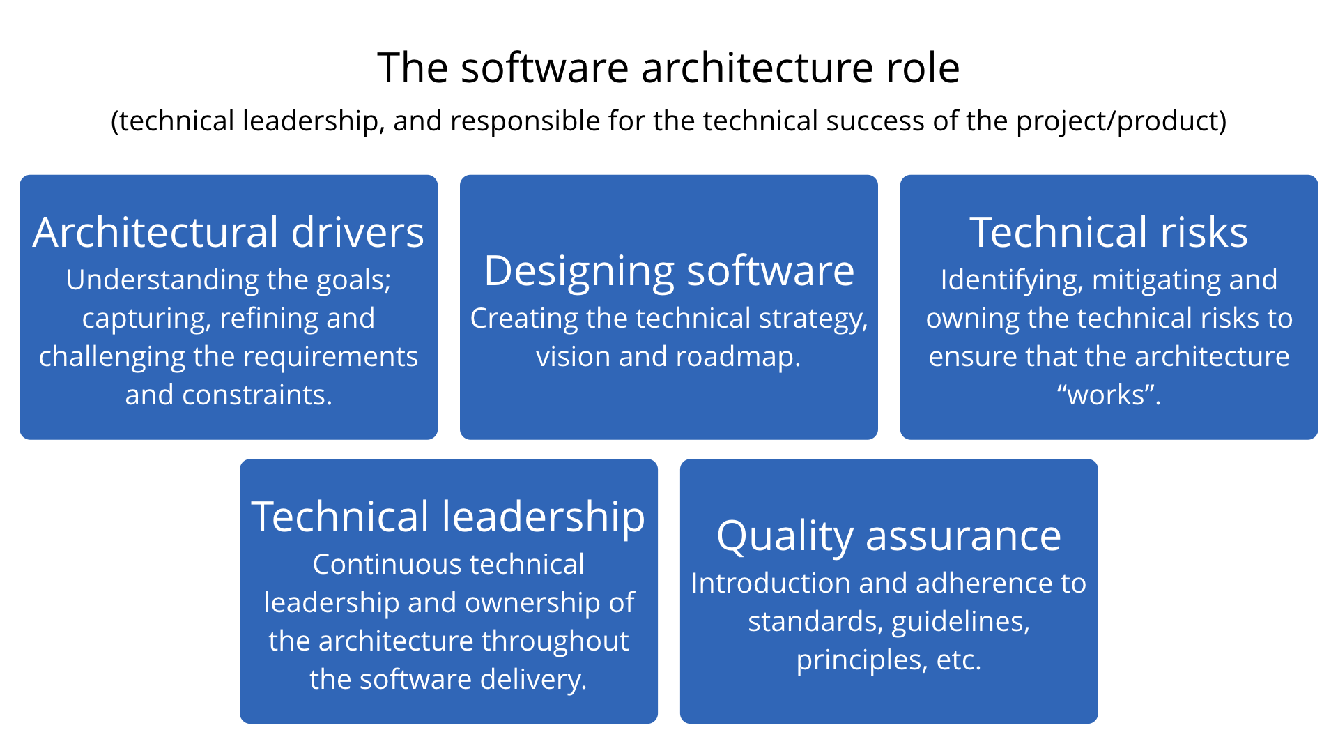 Here are the things I consider to make up the software architecture role, with the summary being that the role is about providing technical leadership and being responsible for the technical success of the project/product. Notice that I said “role” here; it’s something that can be performed by a single person or shared amongst the team, but we’ll talk about that later.