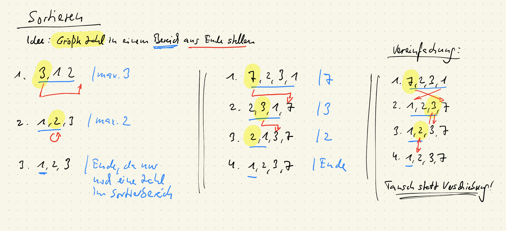 Nur, weil du das kannst, kannst du es aber noch lange nicht auch noch erklären. Wie geht das mit dem Sortieren? Wie gehst du vor? Was ist dein Verfahren, deine Herangehensweise, deine Methode, dein Ansatz? In der ersten Phase des Entwurfs findest du nicht nur heraus, ob du “es” kannst oder “irgendwie weißt wie es geht”. Nein, du musst dein Können und Wissen vermitteln können. Erste Herausforderung: Kannst du es dir selbst erklären? Zweite Herausforderung: Kannst du es anderen erklären?