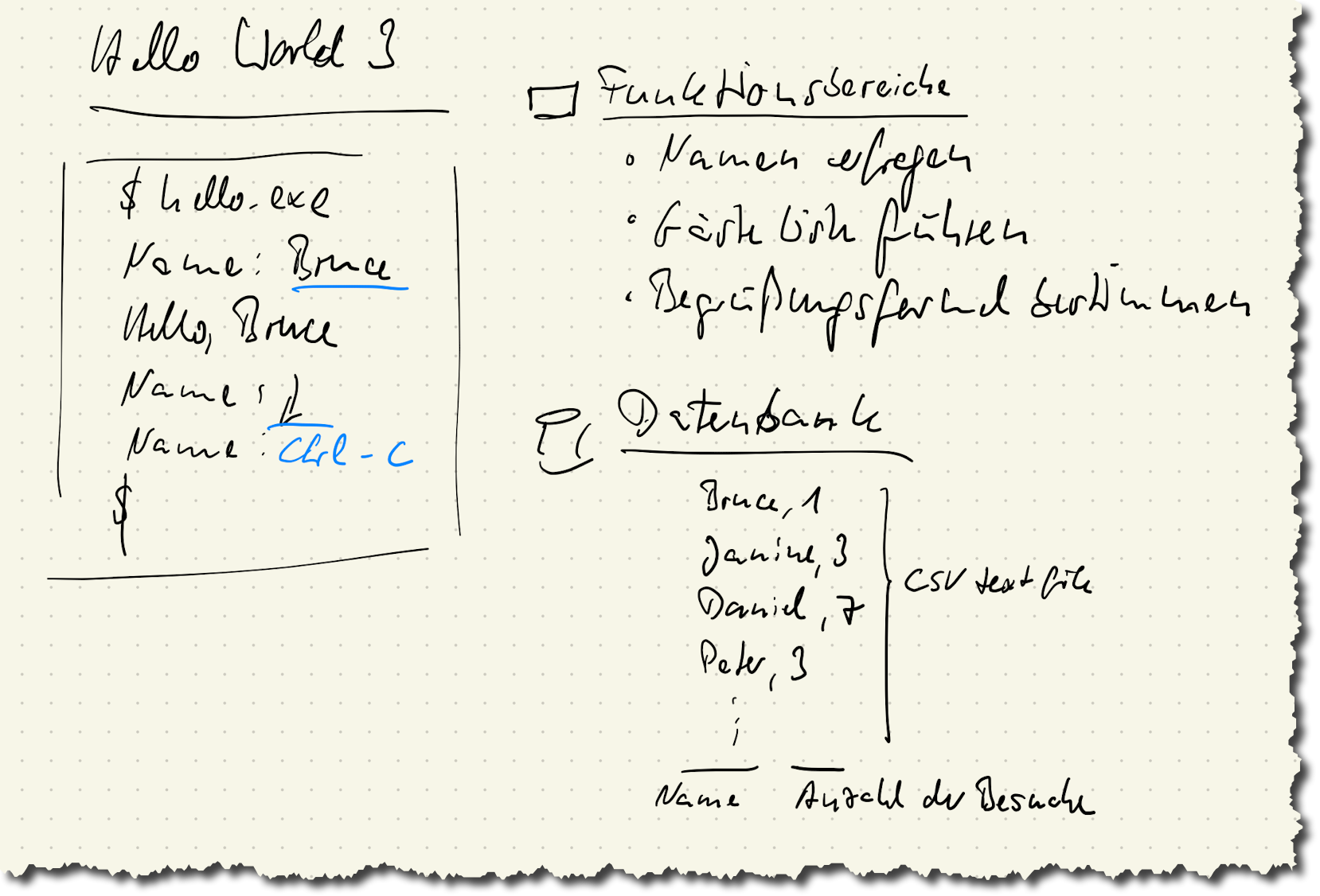 Ein zu Papier gebrachter, expliziter Lösungsansatz hilft dir auch zu iterieren. Sei nicht mit der ersten Idee zufrieden. Wenn du sie vor dir siehst (oder auch nur versuchst, sie vor dich hinzustellen), kann es sein, dass du erstmalig merkst, dass die Idee doch noch nicht so gut ist. Schwierigkeiten in der Visualisierung im Speziellen oder Erklärung mit Worten im Allgemeinen sind ein gutes Signal für dich, weiter darüber nachzudenken. Und so kann es sein, dass du auf einen neuen Lösungsansatz kommst - den du selbstverständlich ebenfalls zu Papier bringst. Hier ein Beispiel für eine Revision der Persistenzidee für das Hello-World Beispiel: