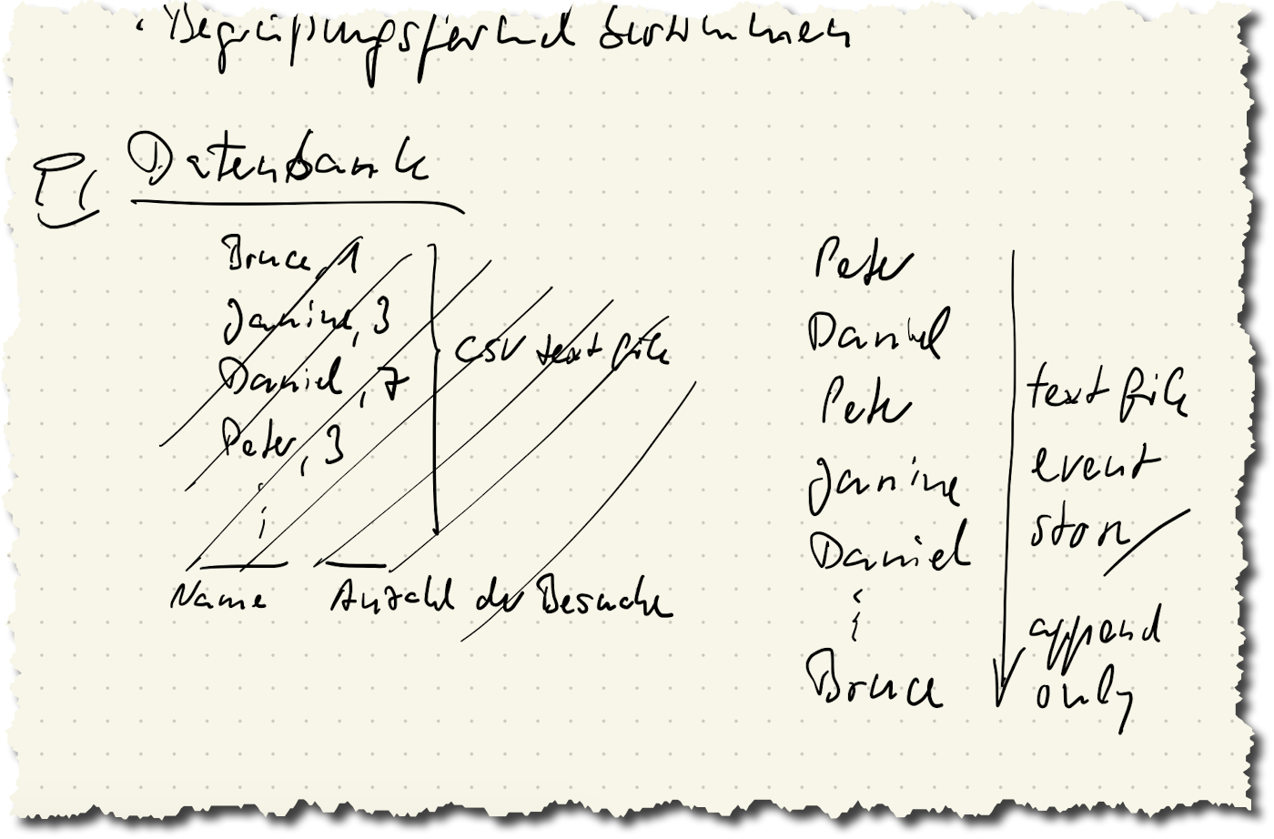 Diesen Ansatz nenne ich Event Store, weil jeder Besuch ein Ereignis ist, das minimal mit dem Besuchernamen dokumentiert wird. Das ist ein total flexibler Ansatz, der ohne Schema auskommt.7