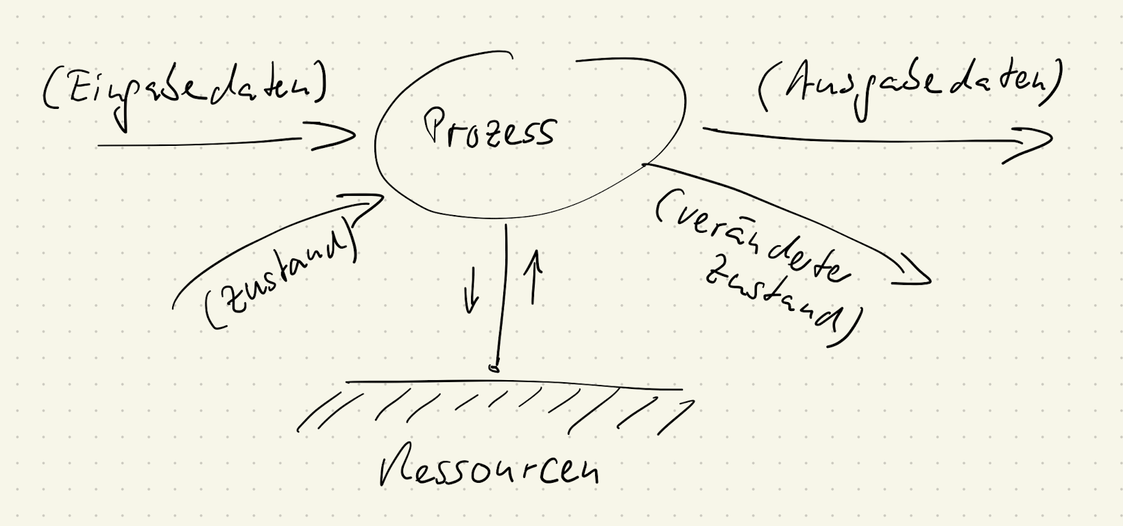 - Zunächst erarbeitest du die Lösung in Form eines Lösungsansatzes. Das ist informell, sehr abstrakt, möglichst visuell und “auf Papier”.