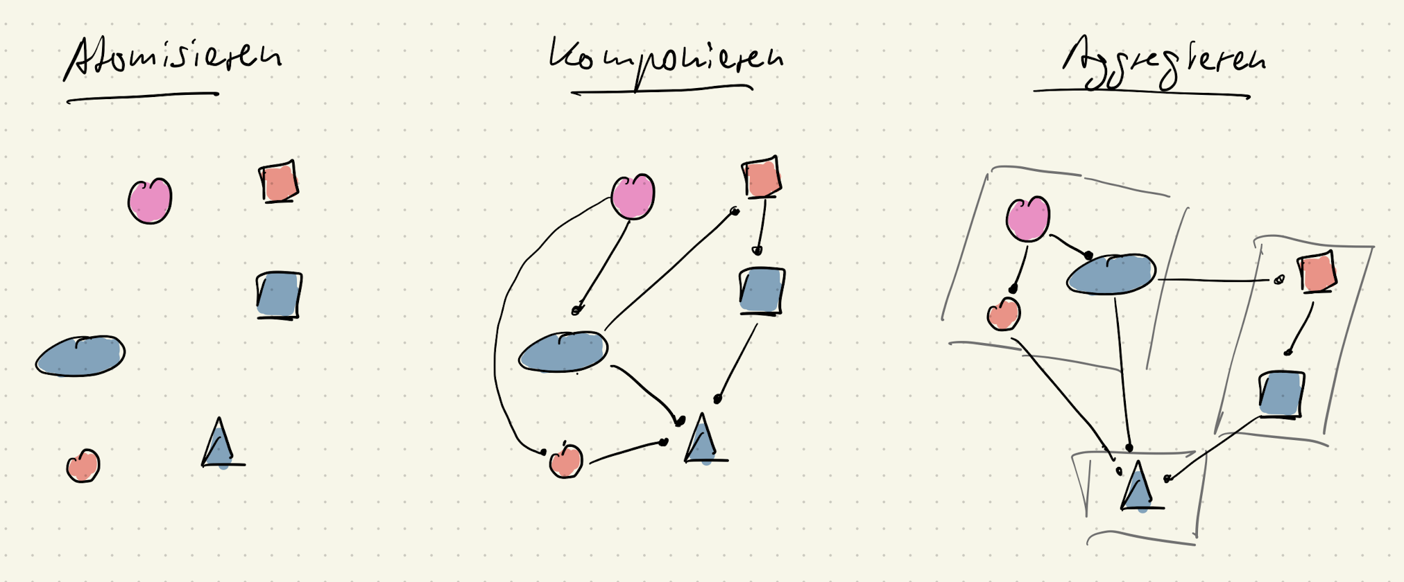 Atomisieren, komponieren und aggregieren sind für mich Abstraktionsleistungen. Für Details, Einzelteile, Feinheiten werden Begriffe gefunden, mit denen es sich leichter umgehen lässt. Und das kann dann sogar auf beliebig vielen Ebenen stattfinden.