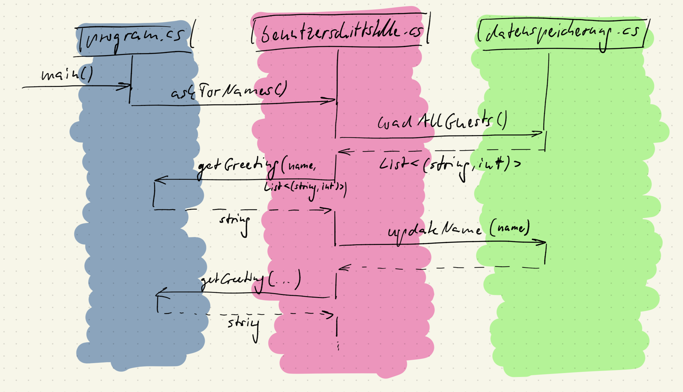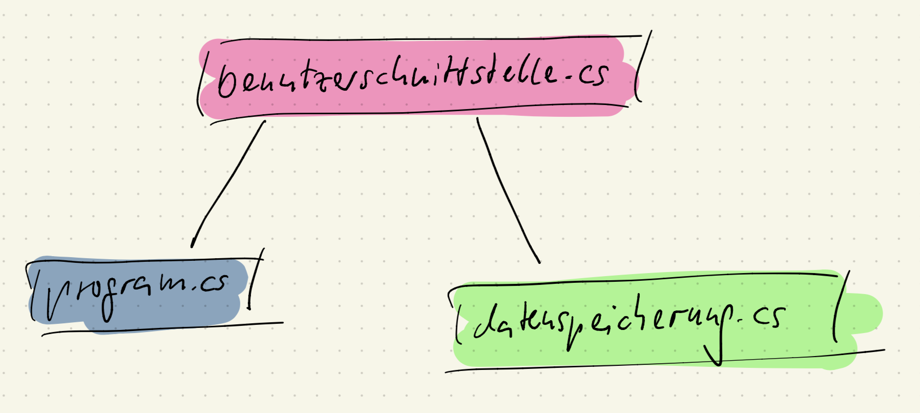 Außerdem soll wahrscheinlich Logik nicht nur einmal in benutzerschnittstelle.cs ausgeführt werden, nachdem z.B. etwas in program.cs passiert ist. Deshalb ist eine Reihenfolgenbeziehung zu wenig. Die Verbindungen zwischen der Logik in den Dateien müssen flexibler sein.