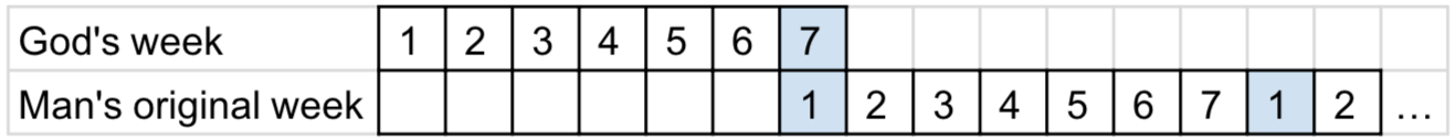 Thus mankind’s first full day was God’s Sabbath day. Day seven of God’s week (as defined by “evening and morning”) was mankind’s first day (as defined by “evening and morning”). This can be diagrammed as follows:
