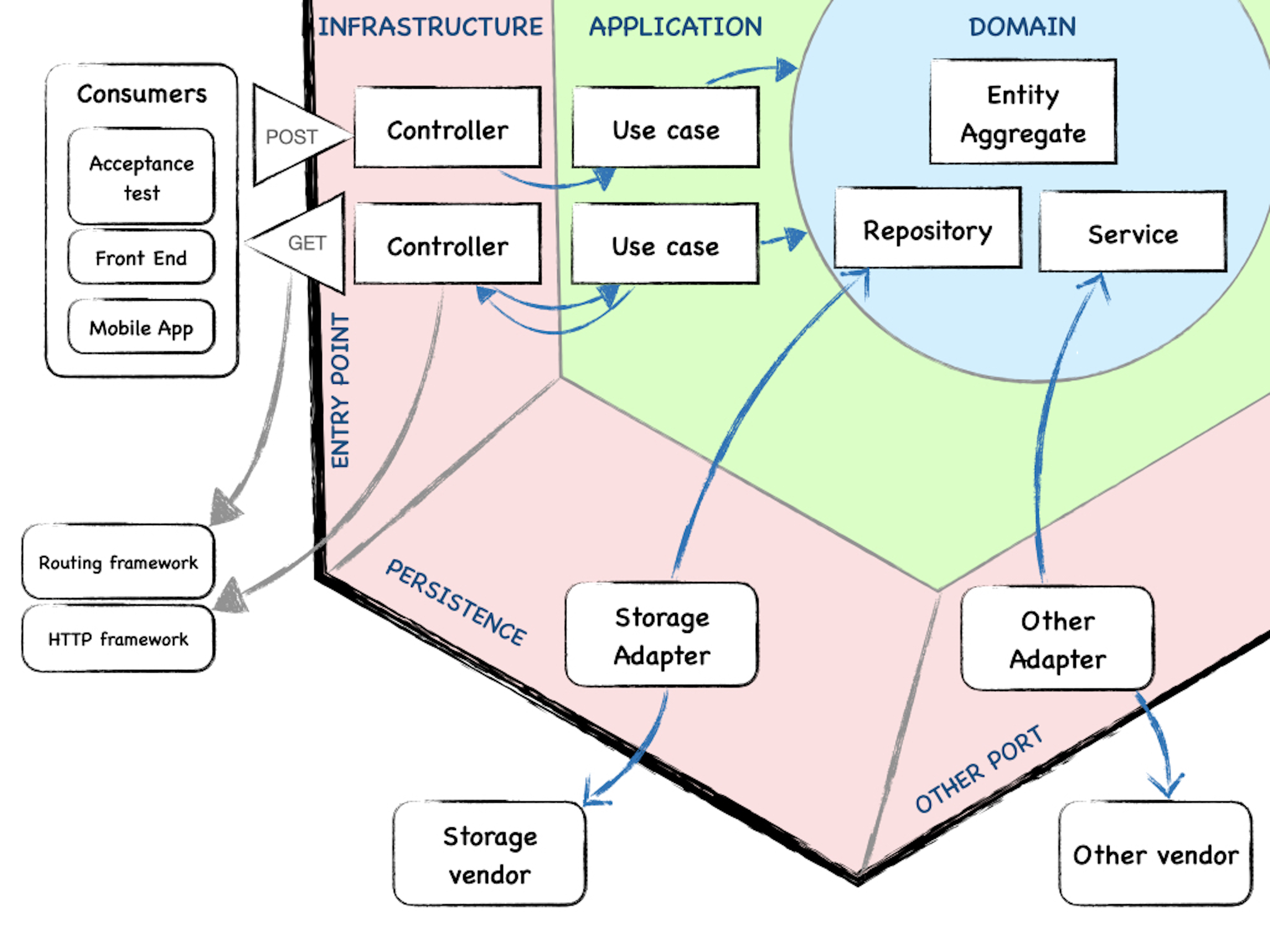- Application: the application’s different use cases, representing its consumer’s intentions.