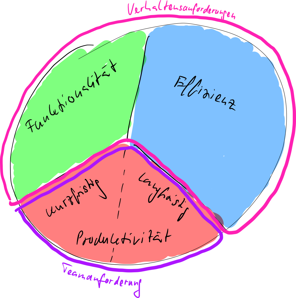 - Funktionalität allein ist allerdings nicht genug - auch das ist dir klar - und noch nicht einmal der Grund für die Beauftragung von Softwareentwicklung. Software soll vor allem nicht-funktionale Anforderungen erfüllen! Sie soll Funktionalität besser (Komparativ!) anbieten als die Alternative (z.B. bisherige Software oder der Mensch). Software soll z.B. schneller oder einfacher oder skalierbarer oder sicherer funktionieren als die Alternative. Dann hat die Effizienz von Software hohe Qualität. Das ist ebenso natürlich, dass es kaum der Rede wert ist - aber diese Anforderungen bereiten dir womöglich noch mehr Kopfschmerzen als die funktionalen.