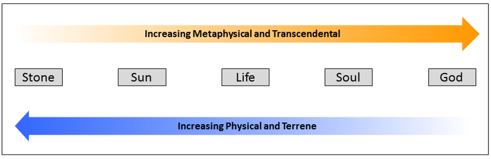 a) We associate the term Life with a certain mystery and fascination, as we do for other terms as well, such as Soul or God. I think these associations have the same cause: all these terms are metaphysical and have a very personal meaning. However, different terms are metaphysical to different degrees as shown in the figure below. You may argue about the examples used there and you may find better examples for the gradients explained, but I think you will understand the basic statement: the term Life has two characteristics in medium degree: a metaphysical and a physical. In its physical characteristic it can be studied, analysed and described scientifically. In its metaphysical characteristic it may be better viewed by the means of humanities.