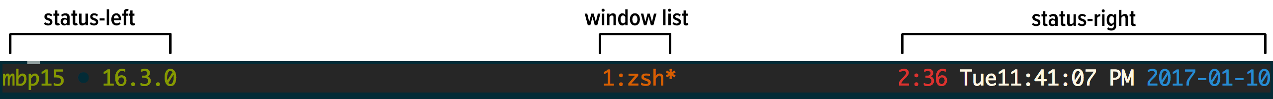 The status bar, or status line, serves as a customizable taskbar in the bottom of tmux. It is comprised of 3 sections. The status fields on either side of the status line are customizable. The center field is a list of windows.